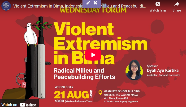 Violent Extremism in Bima, Indonesia: Radical Milieu and Peacebuilding Efforts Bima (West Nusa Tenggara, Indonesia) has a long history of extremist activities. Despite its significance in Indonesia’s terrorist network, violent extremism in Bima remains understudied. We use Malthanaer and Waldman’s concept of the ‘radical milieu’ to answer: how and why has the interaction between Bima’s radical milieu with the local extremist groups escalated and/or de-escalated violent extremism? what are the incentives involved in those interactions which could be useful for strengthening peacebuilding in the future? We argue that extremist groups in Bima have emerged from a social envi¬ronment that shares similar perspectives with them and, to some extent, is sympathetic to their actions in moral or logistical terms. We further argue that this social environment has both served to escalate and de-escalate violent extremism in Bima. Dyah Ayu Kartika is a PhD candidate from Department of Political and Social Change, Australian National University (ANU). Prior from commencing her study at ANU, she worked as a researcher for the National Commission on Violence against Women (Komnas Perempuan), the Center for the Study of Religion and Democracy (PUSAD Paramadina) and the Institute for Policy Analysis of Conflict (IPAC); all based in Jakarta, Indonesia. She also took part as a fellow for New Mandala, an academic blog hosted by the Australian National University, to provide analysis on gender issues during Indonesia’s 2019 election.